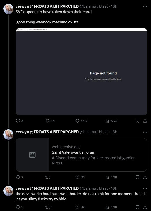 The purpose of this official response is not to address Cerwyn directly. We expect her to continue operating in bad faith, spreading disinformation and deliberately scrutinizing and misinterpreting any line of dialogue we've ever said to paint us in the worst possible light. We have neither the time nor energy to engage her in an endless back-and-forth. So instead, this statement is simply for any normal, sensible people out there who might appreciate having both perspectives in this conflict made publicly available so they can draw their own opinions.Lastly, this carrd was temporarily taken down in order to protect our members from harassment being inflicted on them because of Cerwyn, and Cerwyn's refusal to allow the innocent members of our community to be free from her assault on their safety should be condemned in the strongest possible behaviour for what it is: disgusting, borderline illegal behaviour.