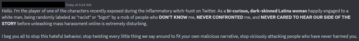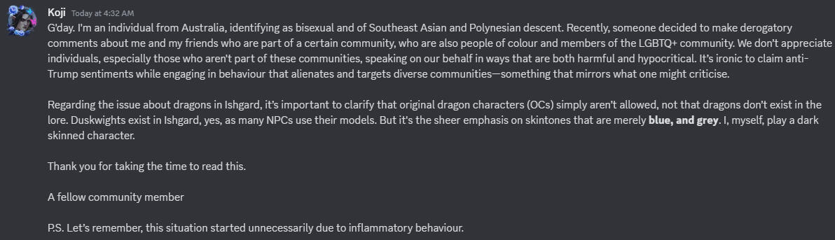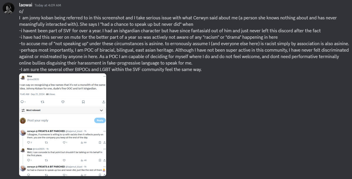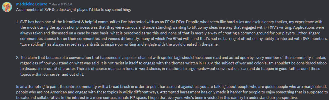 There are some points we would like to address in regards to the current rumours being shared on twitter:1. SVF strongly condemns OOC racism. We are comprised of a large number of BIPOC and LGBTQIA+ players—half of our admin team is BIPOC and LGBTQIA+, and the vast majority of our members are very left-leaning/progressive, so we take serious issue with this allegation.2. SVF allows and encourages people to make native Ishgardian characters who resemble POC. (See House Durendaire, Charibert, etc for examples of Ishgardian characters who resemble POC.) You can see the proof with your own eyes by looking at the members who have been doxxed in our CWLS.3. SVF's rule against grey/blue/purple skinned Duskwights is not based in OOC discrimination, but a lore decision about a fantasy race in a fantasy world. Duskwights are not a parallel to any group of marginalized people in real life—they are a purely fantasy race, and accusing SVF of being racist against BIPOC for excluding them is similar to accusing a dungeon master in D&D for being racist for making homebrew rules excluding tieflings and dragonborns from their campaign. You may not agree with our take on the lore, but to call us racist against real minorities because of it is frankly ridiculous, especially when you know nothing about our personal backgrounds, beliefs or cultural heritage.4. SVF has never and will never police how anyone, including our own members, RP outside of official SVF events & gatherings. We have only enforced our rules within our own server, and we have never restricted players from RPing with whoever and whatever they wish to RP with outside of the server. This is stated clearly in our rules. And we do not enforce our take on the lore on others, as we believe strongly that everyone is allowed to RP whatever they want, with whoever they want, and on whatever concepts they want. And that same respect should be extended to us.5. SVF fully condemns the behaviours of Cerwyn for inciting public harassment and witchhunting against members of SVF, none of whom are racist as she claims, and many of whom are BIPOC and/or LGBTQIA+.6. SVF condemns the notion of "guilt by association" where Cerwyn is inciting the idea that everyone in the CWLS is guilty of being a bad person simply for being in the CWLS. We have attached statements from some of our members who PM'd us during this situation. This "guilt by association" that Cerwyn is pushing is absolutely uncalled for.